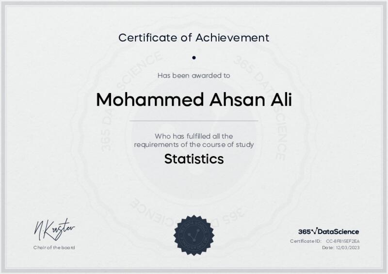 This user has been awarded the Statistics Certificate for successfully completing the course exam. Holding this certificate demonstrates their proficiency on the topic and signifies they are qualified to apply their newly acquired expertise in the fields of data analytics and data science.