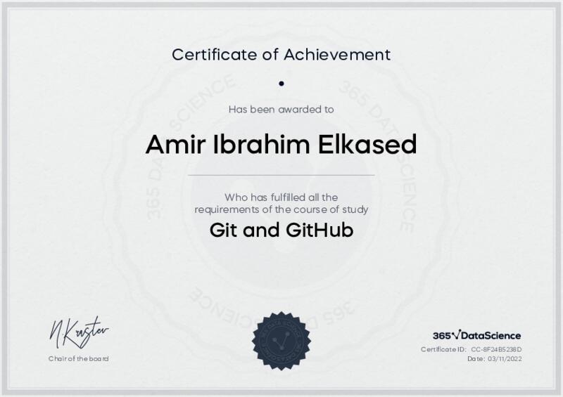 This user has been awarded the Git and GitHub Certificate for successfully completing the course exam. Holding this certificate demonstrates their proficiency on the topic and signifies they are qualified to apply their newly acquired expertise in the fields of data analytics and data science.