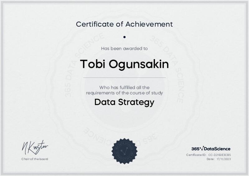 This user has been awarded the Data Strategy Certificate for successfully completing the course exam. Holding this certificate demonstrates their proficiency on the topic and signifies they are qualified to apply their newly acquired expertise in the fields of data analytics and data science.