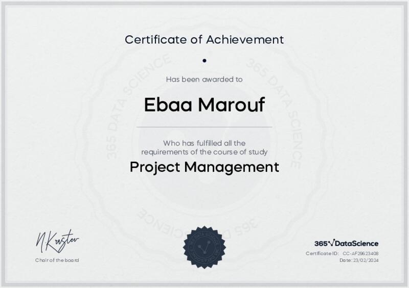This user has been awarded the Project Management Certificate for successfully completing the course exam. Holding this certificate demonstrates their proficiency on the topic and signifies they are qualified to apply their newly acquired expertise in the fields of data analytics and data science.