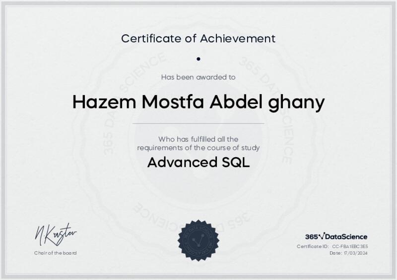 This user has been awarded the Advanced SQL Certificate for successfully completing the course exam. Holding this certificate demonstrates their proficiency on the topic and signifies they are qualified to apply their newly acquired expertise in the fields of data analytics and data science.