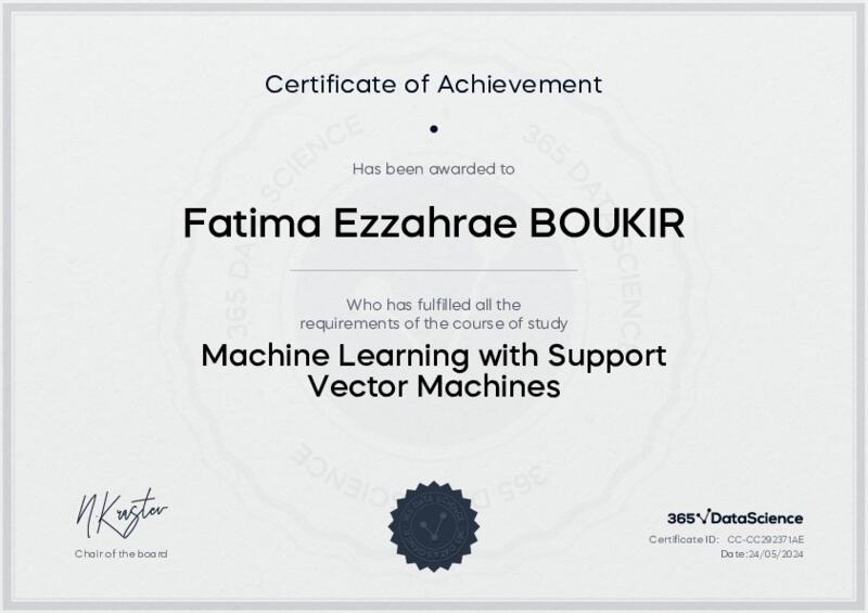 This user has been awarded the Machine Learning with Support Vector Machines Certificate for successfully completing the course exam. Holding this certificate demonstrates their proficiency on the topic and signifies they are qualified to apply their newly acquired expertise in the fields of data analytics and data science.