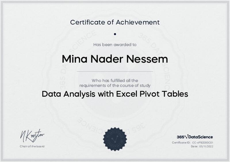 This user has been awarded the Data Analysis with Excel Pivot Tables Certificate for successfully completing the course exam. Holding this certificate demonstrates their proficiency on the topic and signifies they are qualified to apply their newly acquired expertise in the fields of data analytics and data science.