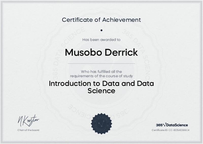 This user has been awarded the Introduction to Data and Data Science Certificate for successfully completing the course exam. Holding this certificate demonstrates their proficiency on the topic and signifies they are qualified to apply their newly acquired expertise in the fields of data analytics and data science.