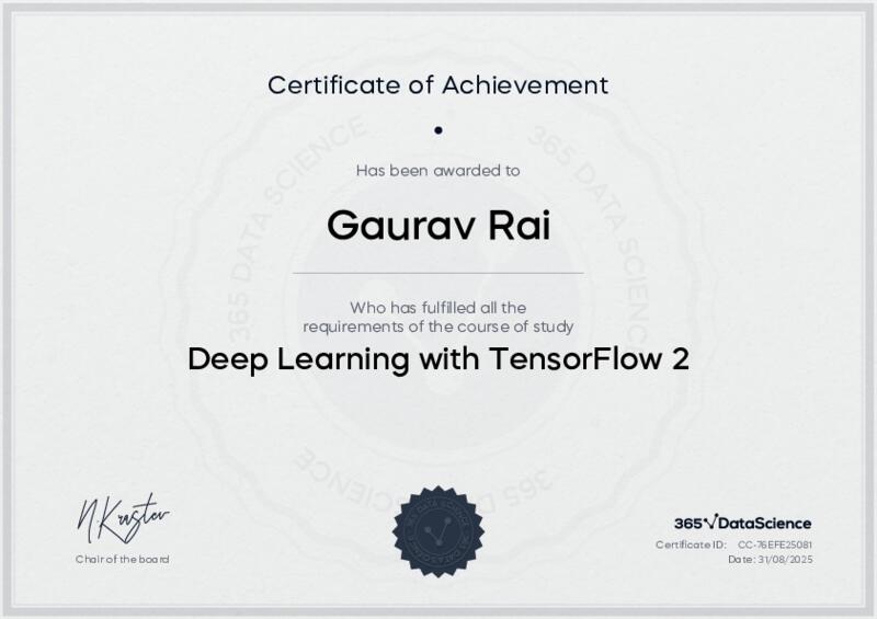 This user has been awarded the Deep Learning with TensorFlow 2 Certificate for successfully completing the course exam. Holding this certificate demonstrates their proficiency on the topic and signifies they are qualified to apply their newly acquired expertise in the fields of data analytics and data science.