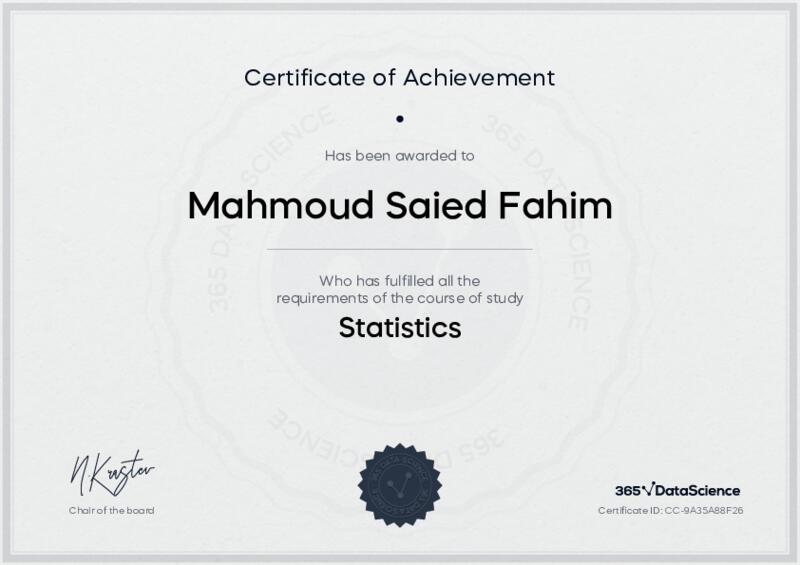 This user has been awarded the Statistics Certificate for successfully completing the course exam. Holding this certificate demonstrates their proficiency on the topic and signifies they are qualified to apply their newly acquired expertise in the fields of data analytics and data science.
