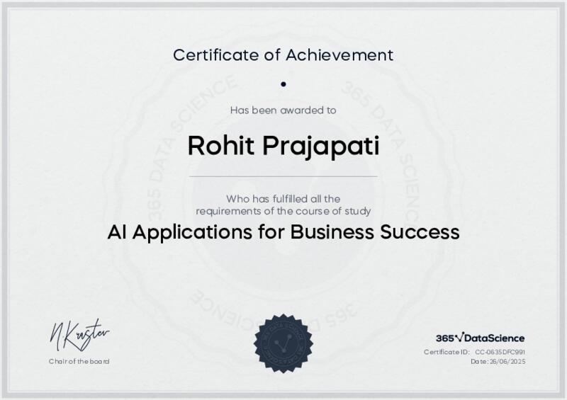 This user has been awarded the AI Applications for Business Success Certificate for successfully completing the course exam. Holding this certificate demonstrates their proficiency on the topic and signifies they are qualified to apply their newly acquired expertise in the fields of data analytics and data science.