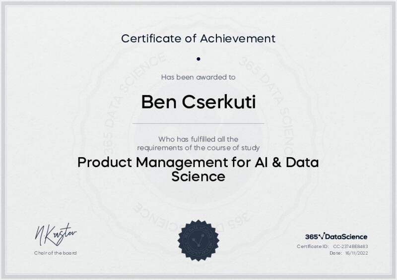 This user has been awarded the Product Management for AI & Data Science Certificate for successfully completing the course exam. Holding this certificate demonstrates their proficiency on the topic and signifies they are qualified to apply their newly acquired expertise in the fields of data analytics and data science.