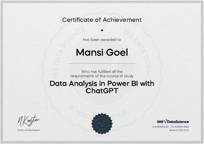 This user has been awarded the Data Analysis in PowerBI with ChatGPT Certificate for successfully completing the course exam. Holding this certificate demonstrates their proficiency on the topic and signifies they are qualified to apply their newly acquired expertise in the fields of data analytics and data science.