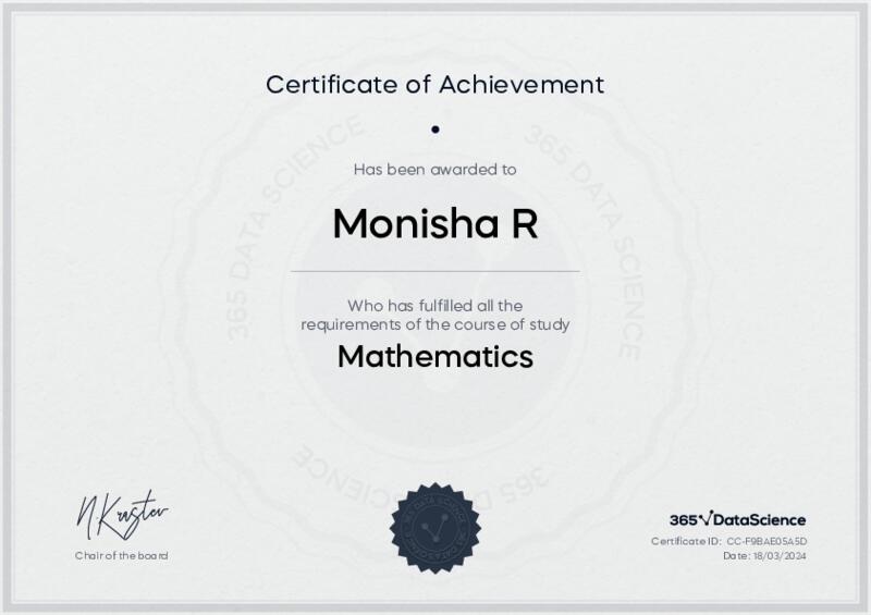 This user has been awarded the Mathematics Certificate for successfully completing the course exam. Holding this certificate demonstrates their proficiency on the topic and signifies they are qualified to apply their newly acquired expertise in the fields of data analytics and data science.