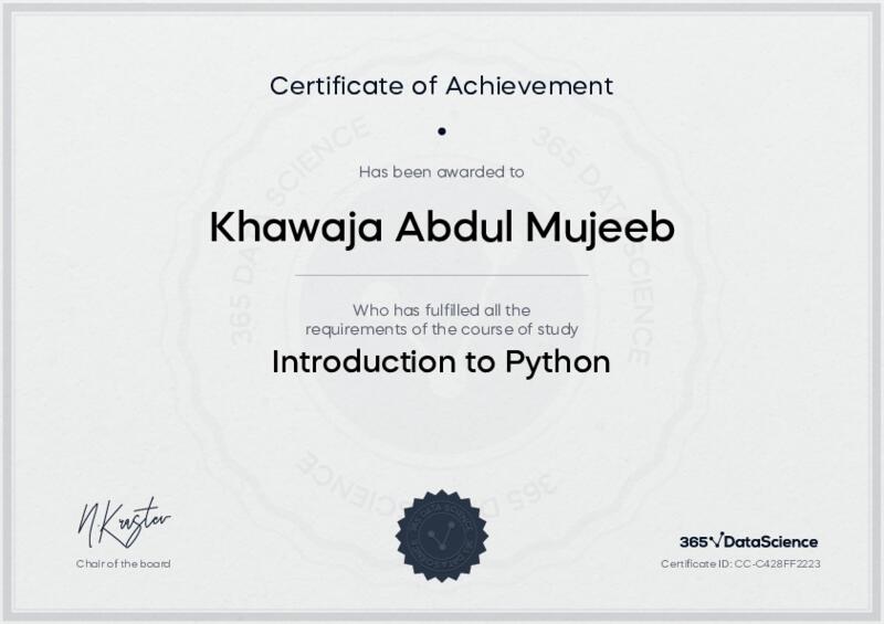 This user has been awarded the Introduction to Python Certificate for successfully completing the course exam. Holding this certificate demonstrates their proficiency on the topic and signifies they are qualified to apply their newly acquired expertise in the fields of data analytics and data science.