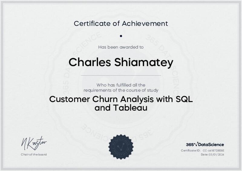 This user has been awarded the Customer Churn Analysis with SQL and Tableau Certificate for successfully completing the course exam. Holding this certificate demonstrates their proficiency on the topic and signifies they are qualified to apply their newly acquired expertise in the fields of data analytics and data science.