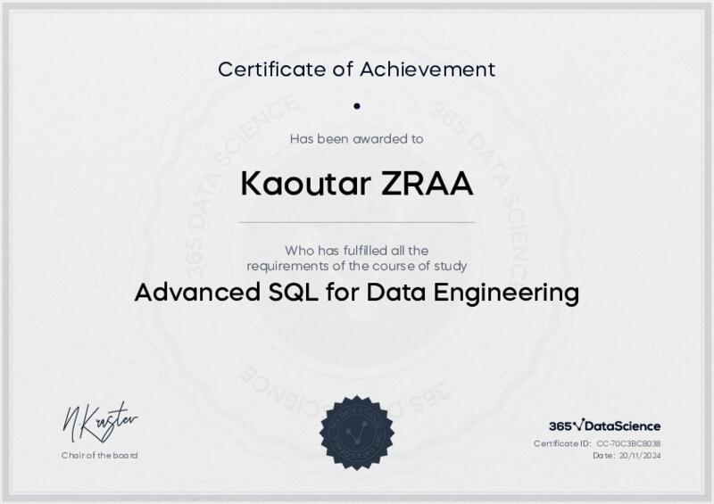 This user has been awarded the Advanced SQL for Data Engineering Certificate for successfully completing the course exam. Holding this certificate demonstrates their proficiency on the topic and signifies they are qualified to apply their newly acquired expertise in the fields of data analytics and data science.