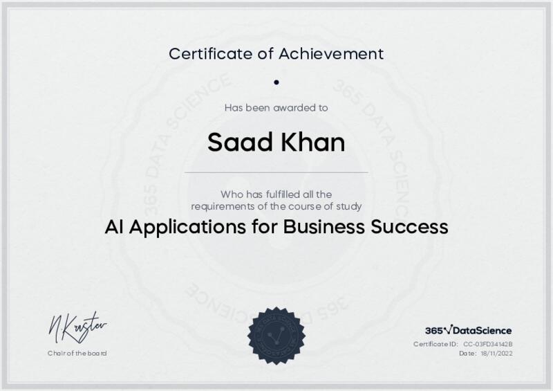 This user has been awarded the AI Applications for Business Success Certificate for successfully completing the course exam. Holding this certificate demonstrates their proficiency on the topic and signifies they are qualified to apply their newly acquired expertise in the fields of data analytics and data science.