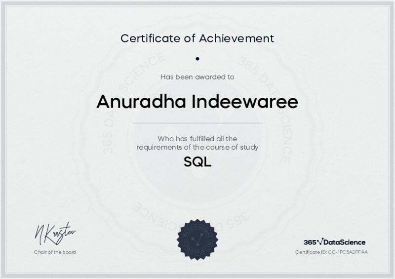 This user has been awarded the SQL Certificate for successfully completing the course exam. Holding this certificate demonstrates their proficiency on the topic and signifies they are qualified to apply their newly acquired expertise in the fields of data analytics and data science.
