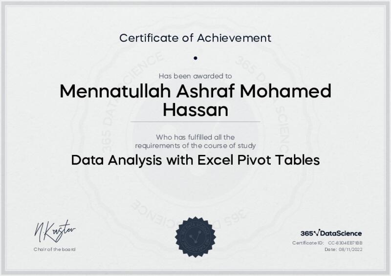 This user has been awarded the Data Analysis with Excel Pivot Tables Certificate for successfully completing the course exam. Holding this certificate demonstrates their proficiency on the topic and signifies they are qualified to apply their newly acquired expertise in the fields of data analytics and data science.