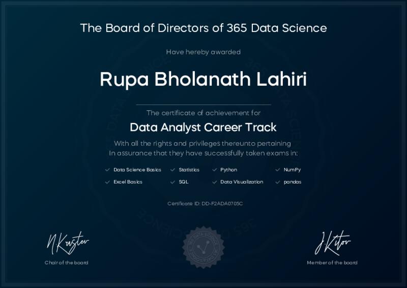This user has been awarded the Data Analyst Career Track Certificate for successfully completing all courses and assessments. This certificate confirms their technical expertise and professional credibility to work as a data analyst.