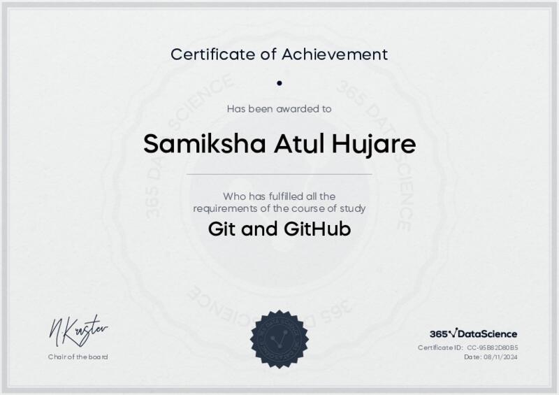 This user has been awarded the Git and GitHub Certificate for successfully completing the course exam. Holding this certificate demonstrates their proficiency on the topic and signifies they are qualified to apply their newly acquired expertise in the fields of data analytics and data science.