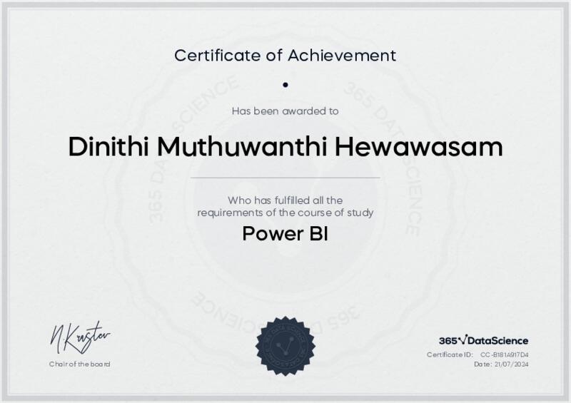 This user has been awarded the Power BI Certificate for successfully completing the course exam. Holding this certificate demonstrates their proficiency on the topic and signifies they are qualified to apply their newly acquired expertise in the fields of data analytics and data science.