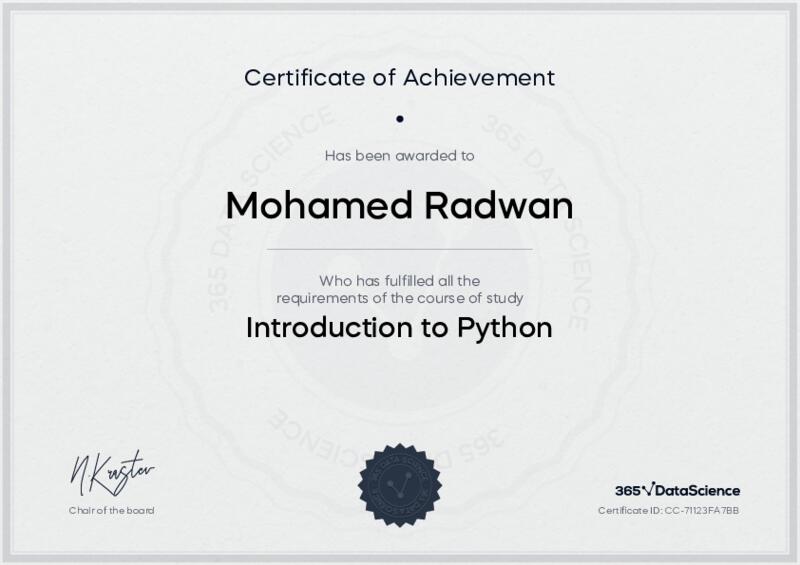 This user has been awarded the Introduction to Python Certificate for successfully completing the course exam. Holding this certificate demonstrates their proficiency on the topic and signifies they are qualified to apply their newly acquired expertise in the fields of data analytics and data science.