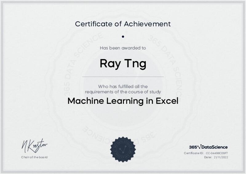 This user has been awarded the Machine Learning in Excel Certificate for successfully completing the course exam. Holding this certificate demonstrates their proficiency on the topic and signifies they are qualified to apply their newly acquired expertise in the fields of data analytics and data science.
