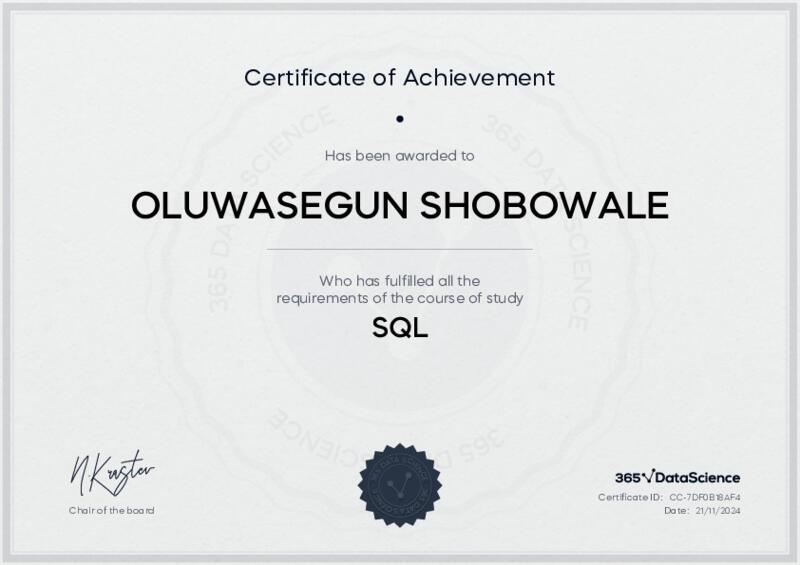This user has been awarded the SQL Certificate for successfully completing the course exam. Holding this certificate demonstrates their proficiency on the topic and signifies they are qualified to apply their newly acquired expertise in the fields of data analytics and data science.