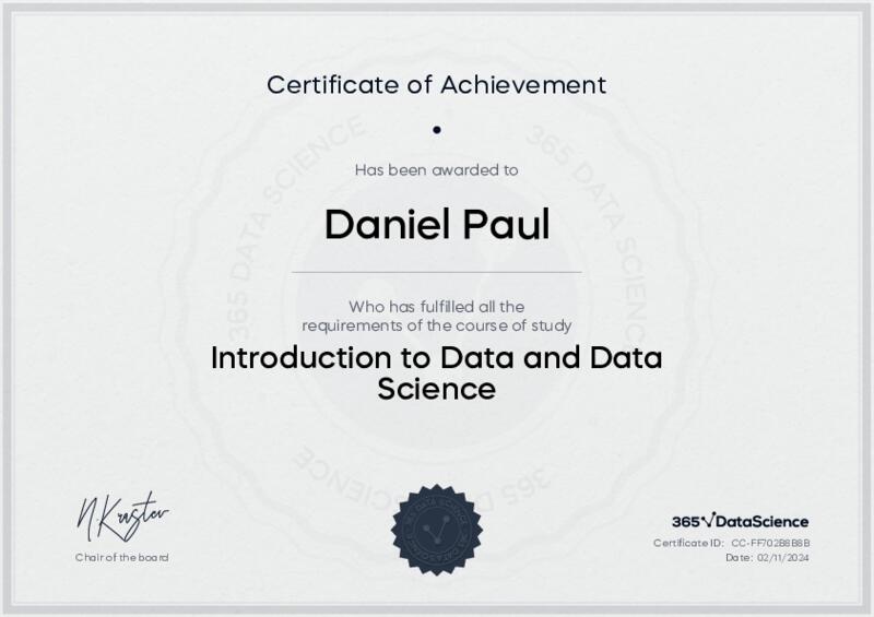 This user has been awarded the Introduction to Data and Data Science Certificate for successfully completing the course exam. Holding this certificate demonstrates their proficiency on the topic and signifies they are qualified to apply their newly acquired expertise in the fields of data analytics and data science.
