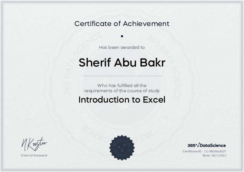 This user has been awarded the Introduction to Excel Certificate for successfully completing the course exam. Holding this certificate demonstrates their proficiency on the topic and signifies they are qualified to apply their newly acquired expertise in the fields of data analytics and data science.