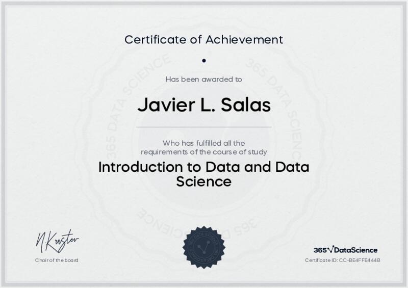 This user has been awarded the Introduction to Data and Data Science Certificate for successfully completing the course exam. Holding this certificate demonstrates their proficiency on the topic and signifies they are qualified to apply their newly acquired expertise in the fields of data analytics and data science.