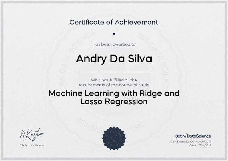 This user has been awarded the Machine Learning with Ridge and Lasso Regression Certificate for successfully completing the course exam. Holding this certificate demonstrates their proficiency on the topic and signifies they are qualified to apply their newly acquired expertise in the fields of data analytics and data science.