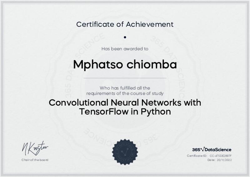 This user has been awarded the Convolutional Neural Networks with TensorFlow in Python Certificate for successfully completing the course exam. Holding this certificate demonstrates their proficiency on the topic and signifies they are qualified to apply their newly acquired expertise in the fields of data analytics and data science.