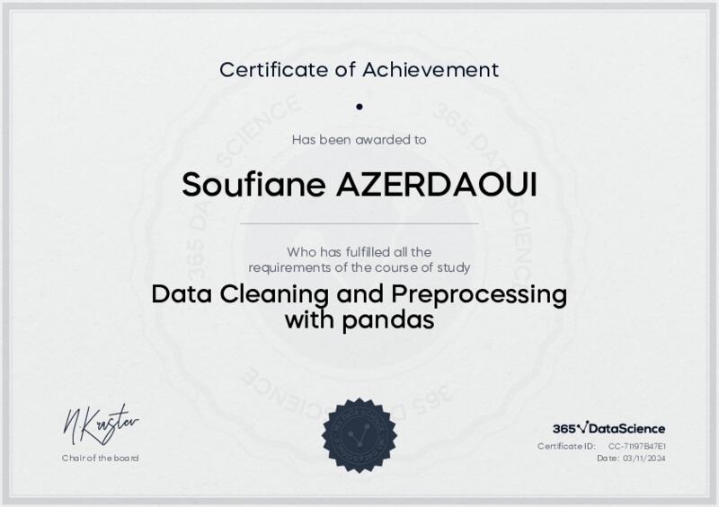 This user has been awarded the Data Cleaning and Preprocessing with pandas Certificate for successfully completing the course exam. Holding this certificate demonstrates their proficiency on the topic and signifies they are qualified to apply their newly acquired expertise in the fields of data analytics and data science.