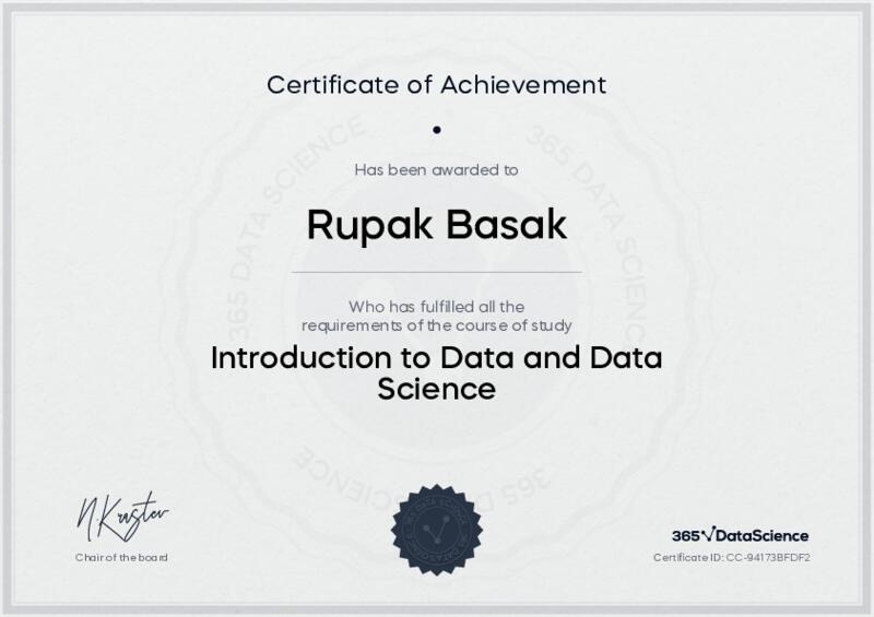 This user has been awarded the Introduction to Data and Data Science Certificate for successfully completing the course exam. Holding this certificate demonstrates their proficiency on the topic and signifies they are qualified to apply their newly acquired expertise in the fields of data analytics and data science.