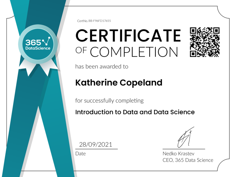 Congratulations! You have been awarded the 365 Data Science Certificate for successfully completing this course. Holding this certificate demonstrates your proficiency on the topic and your ability to apply your newly acquired expertise in the fields of data analytics and data science with confidence.