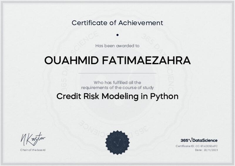 This user has been awarded the Credit Risk Modeling in Python Certificate for successfully completing the course exam. Holding this certificate demonstrates their proficiency on the topic and signifies they are qualified to apply their newly acquired expertise in the fields of data analytics and data science.
