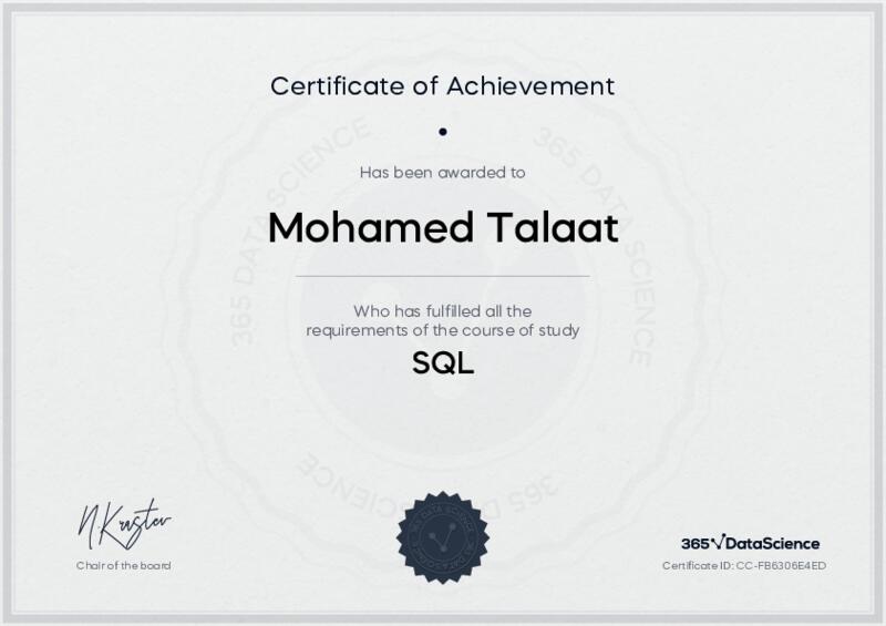 This user has been awarded the SQL Certificate for successfully completing the course exam. Holding this certificate demonstrates their proficiency on the topic and signifies they are qualified to apply their newly acquired expertise in the fields of data analytics and data science.