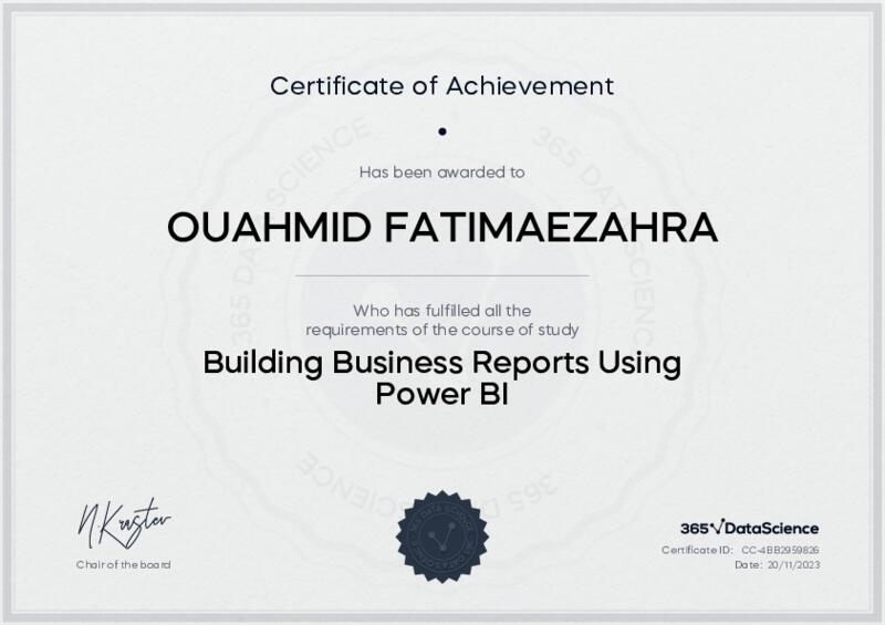 This user has been awarded the Building Business Reports Using Power BI Certificate for successfully completing the course exam. Holding this certificate demonstrates their proficiency on the topic and signifies they are qualified to apply their newly acquired expertise in the fields of data analytics and data science.