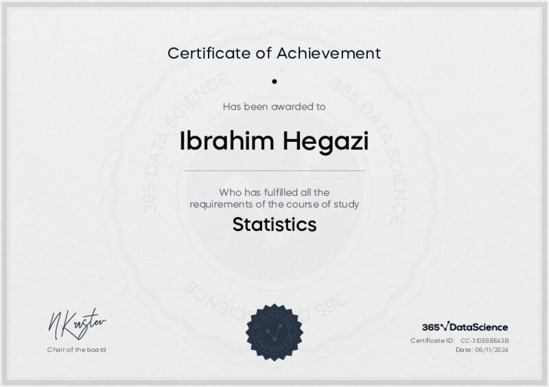 This user has been awarded the Statistics Certificate for successfully completing the course exam. Holding this certificate demonstrates their proficiency on the topic and signifies they are qualified to apply their newly acquired expertise in the fields of data analytics and data science.