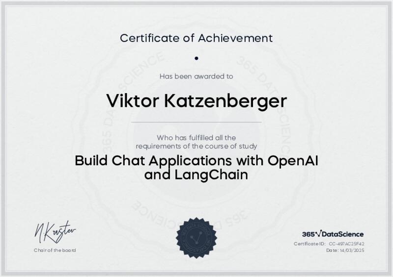 This user has been awarded the Build Chat Applications with OpenAI and LangChain Certificate for successfully completing the course exam. Holding this certificate demonstrates their proficiency on the topic and signifies they are qualified to apply their newly acquired expertise in the fields of data analytics and data science.