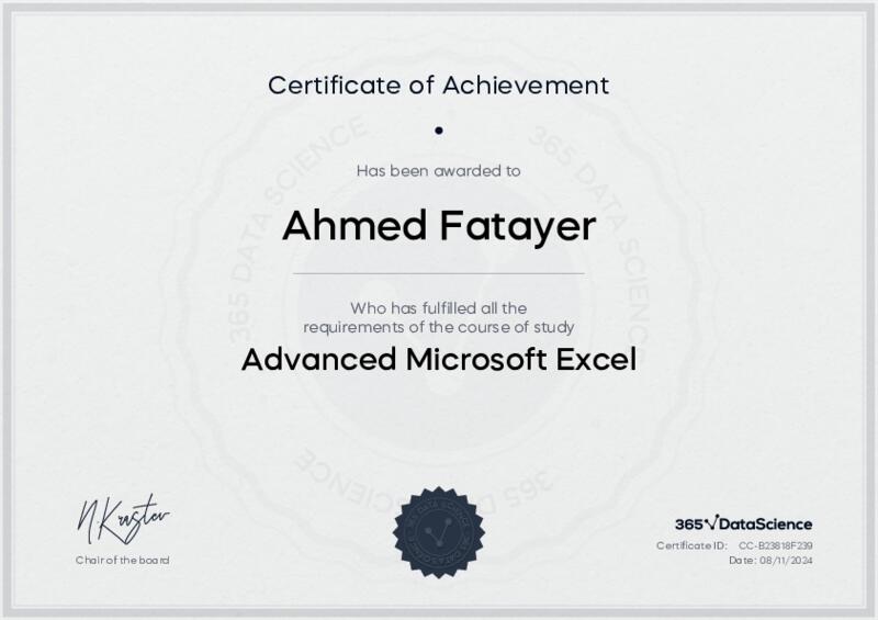 This user has been awarded the Advanced Microsoft Excel Certificate for successfully completing the course exam. Holding this certificate demonstrates their proficiency on the topic and signifies they are qualified to apply their newly acquired expertise in the fields of data analytics and data science.