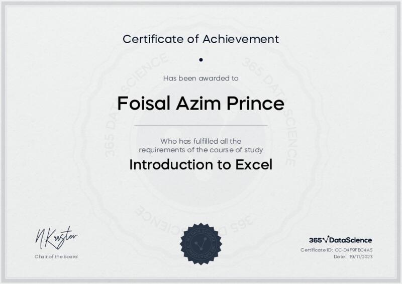 This user has been awarded the Introduction to Excel Certificate for successfully completing the course exam. Holding this certificate demonstrates their proficiency on the topic and signifies they are qualified to apply their newly acquired expertise in the fields of data analytics and data science.
