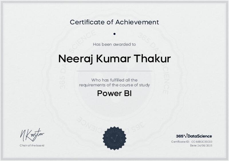 This user has been awarded the Power BI Certificate for successfully completing the course exam. Holding this certificate demonstrates their proficiency on the topic and signifies they are qualified to apply their newly acquired expertise in the fields of data analytics and data science.