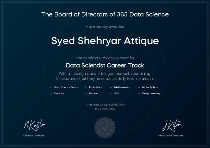 This user has been awarded the Data Scientist Career Track Certificate for successfully completing all courses and assessments. This certificate confirms their technical expertise and professional credibility to work as a data scientist.