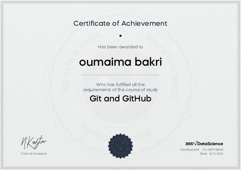 This user has been awarded the Git and GitHub Certificate for successfully completing the course exam. Holding this certificate demonstrates their proficiency on the topic and signifies they are qualified to apply their newly acquired expertise in the fields of data analytics and data science.