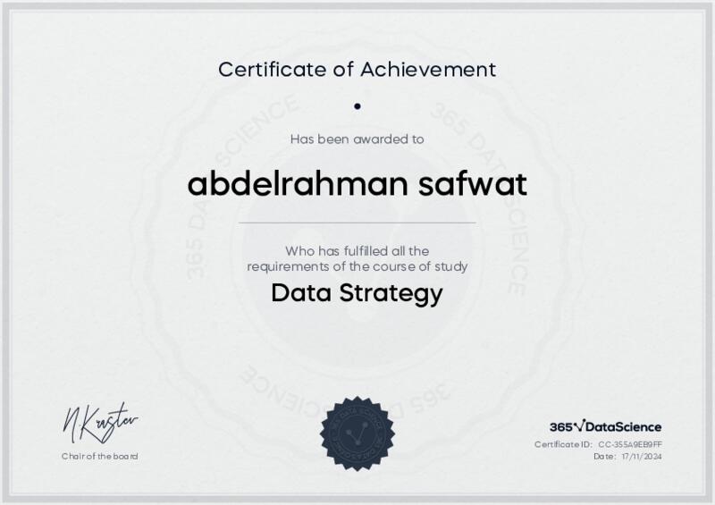 This user has been awarded the Data Strategy Certificate for successfully completing the course exam. Holding this certificate demonstrates their proficiency on the topic and signifies they are qualified to apply their newly acquired expertise in the fields of data analytics and data science.