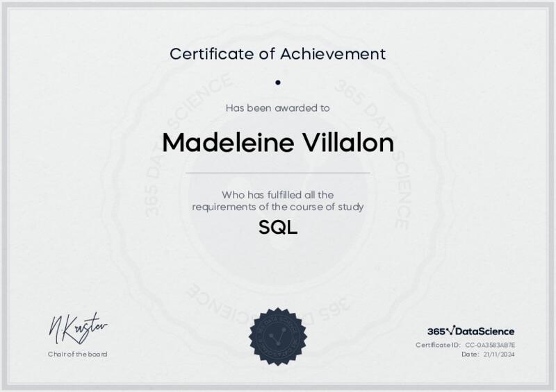 This user has been awarded the SQL Certificate for successfully completing the course exam. Holding this certificate demonstrates their proficiency on the topic and signifies they are qualified to apply their newly acquired expertise in the fields of data analytics and data science.