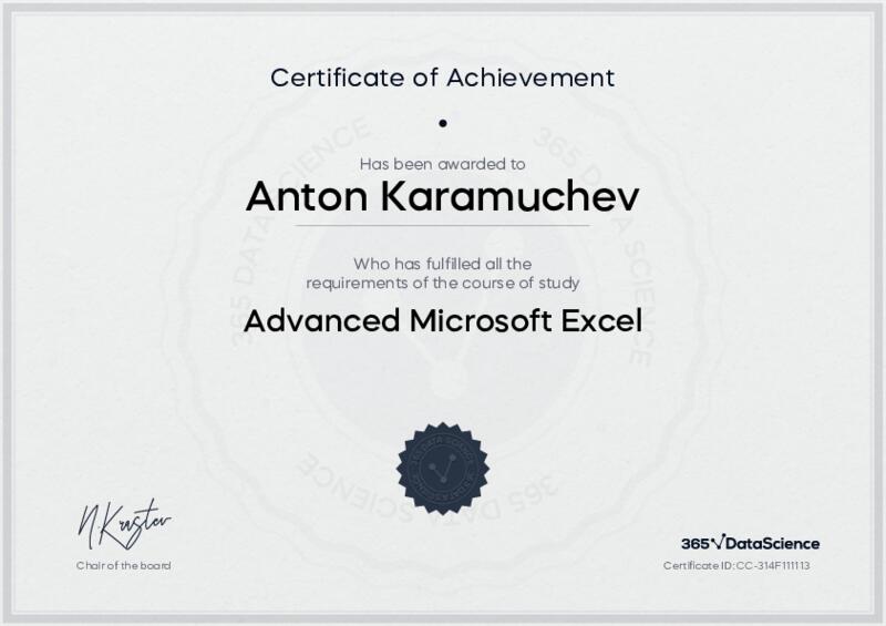 This user has been awarded the Advanced Microsoft Excel Certificate for successfully completing the course exam. Holding this certificate demonstrates their proficiency on the topic and signifies they are qualified to apply their newly acquired expertise in the fields of data analytics and data science.