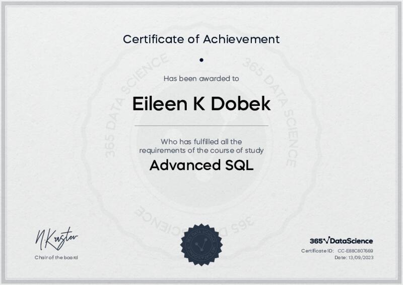 This user has been awarded the Advanced SQL Certificate for successfully completing the course exam. Holding this certificate demonstrates their proficiency on the topic and signifies they are qualified to apply their newly acquired expertise in the fields of data analytics and data science.