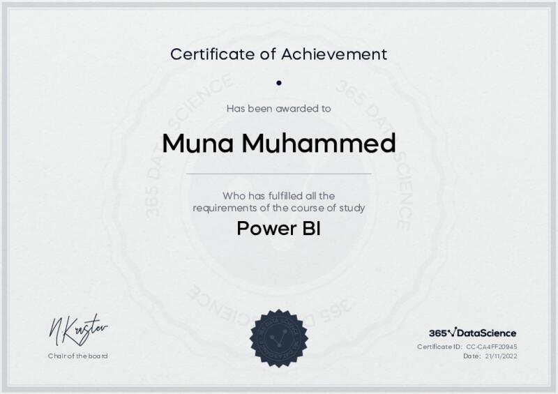 This user has been awarded the Power BI Certificate for successfully completing the course exam. Holding this certificate demonstrates their proficiency on the topic and signifies they are qualified to apply their newly acquired expertise in the fields of data analytics and data science.