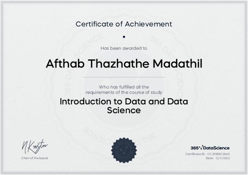 This user has been awarded the Introduction to Data and Data Science Certificate for successfully completing the course exam. Holding this certificate demonstrates their proficiency on the topic and signifies they are qualified to apply their newly acquired expertise in the fields of data analytics and data science.